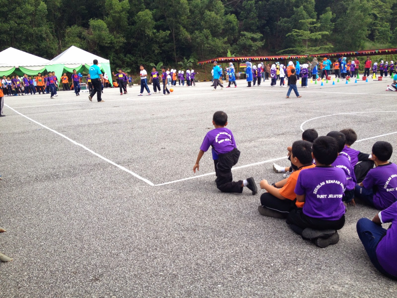 about half an hour after that they started the actual sports events. i also like this bit, they ran three events concurrently, so at one time all there boys were doing their events. ariff had to pull a ball with a hoop while asyraf had to jump with a ball and throw a hoop. funny that ariff's turn came just as asyraf's turn ended. both ariff and asyraf's team came in first - at almost the same time!